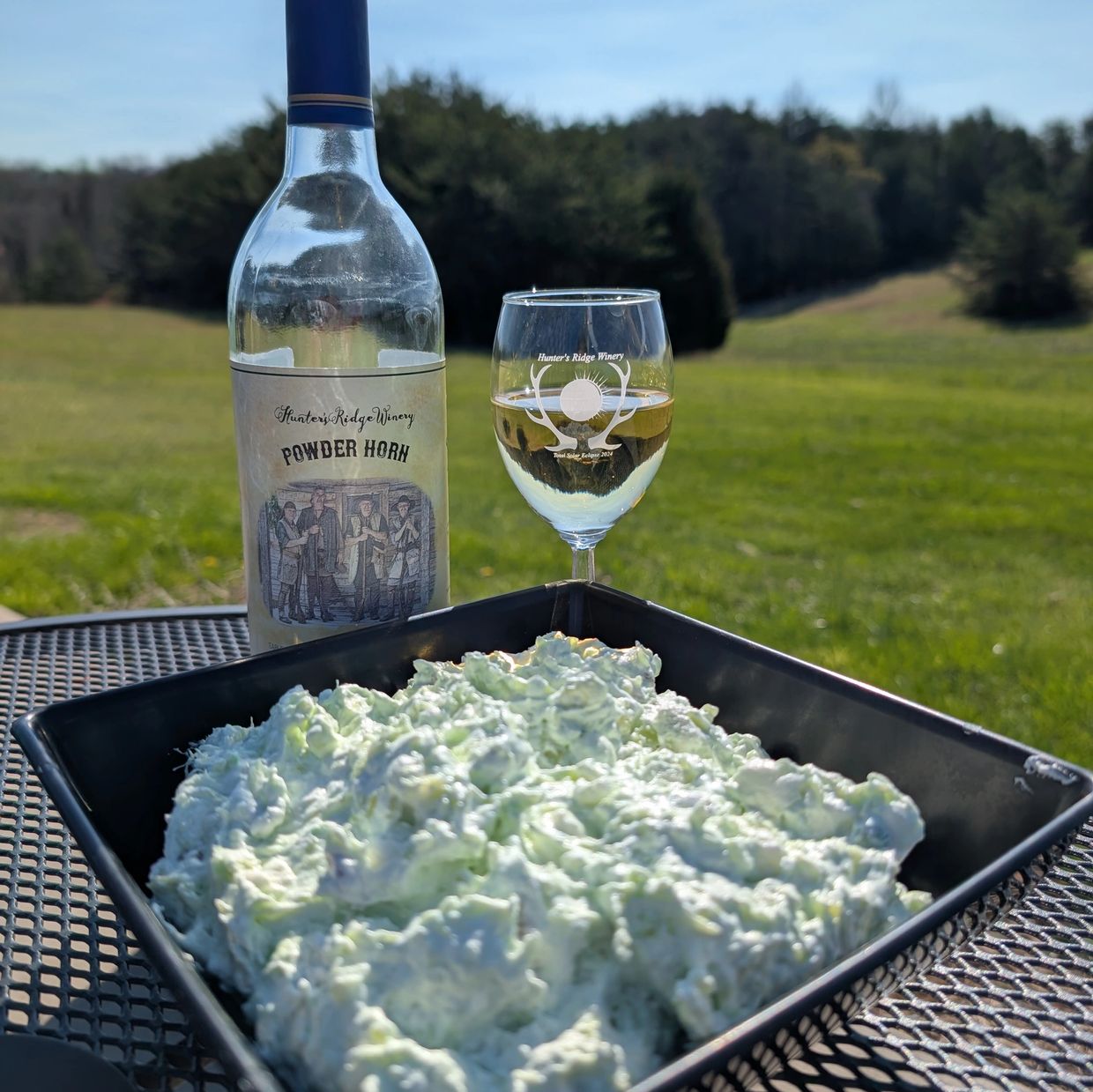 April is the start of everyone getting out of the cold dark of winter, so a sweet dessert paired with a sharp, clean off dry white is a great pick me up! Our Powder Horn does have a sharp flavor with a hint of pineapple, which pairs well with the pineapple spread throughout the dessert.